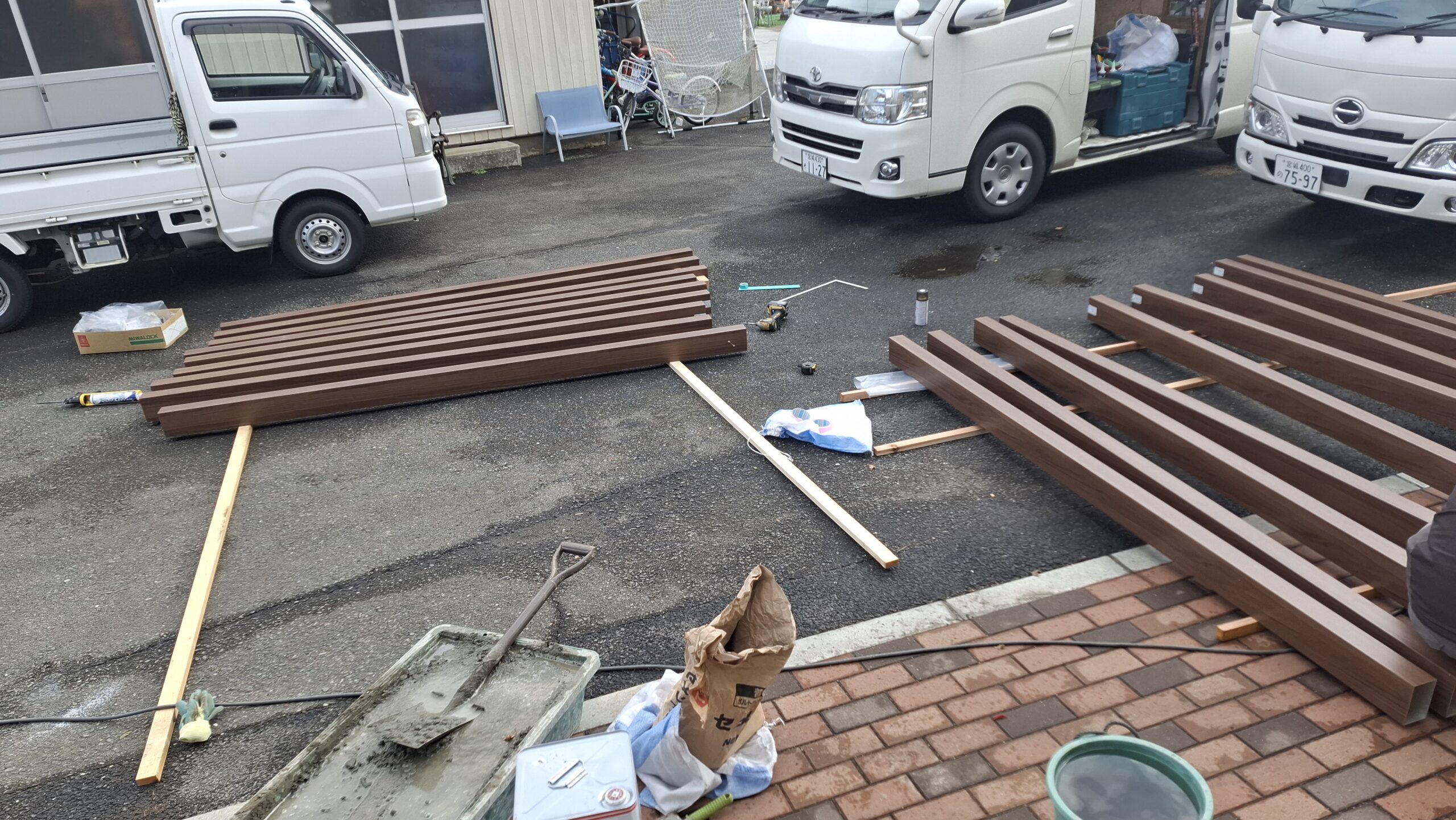 今回提案して施工したのはLIXIL製アルミ枕木デザイナーズパーツ、クリエモカ色を施主様のご要望の高さ、隙間に均等に揃えて1本1本切断加工して施工いたしました。