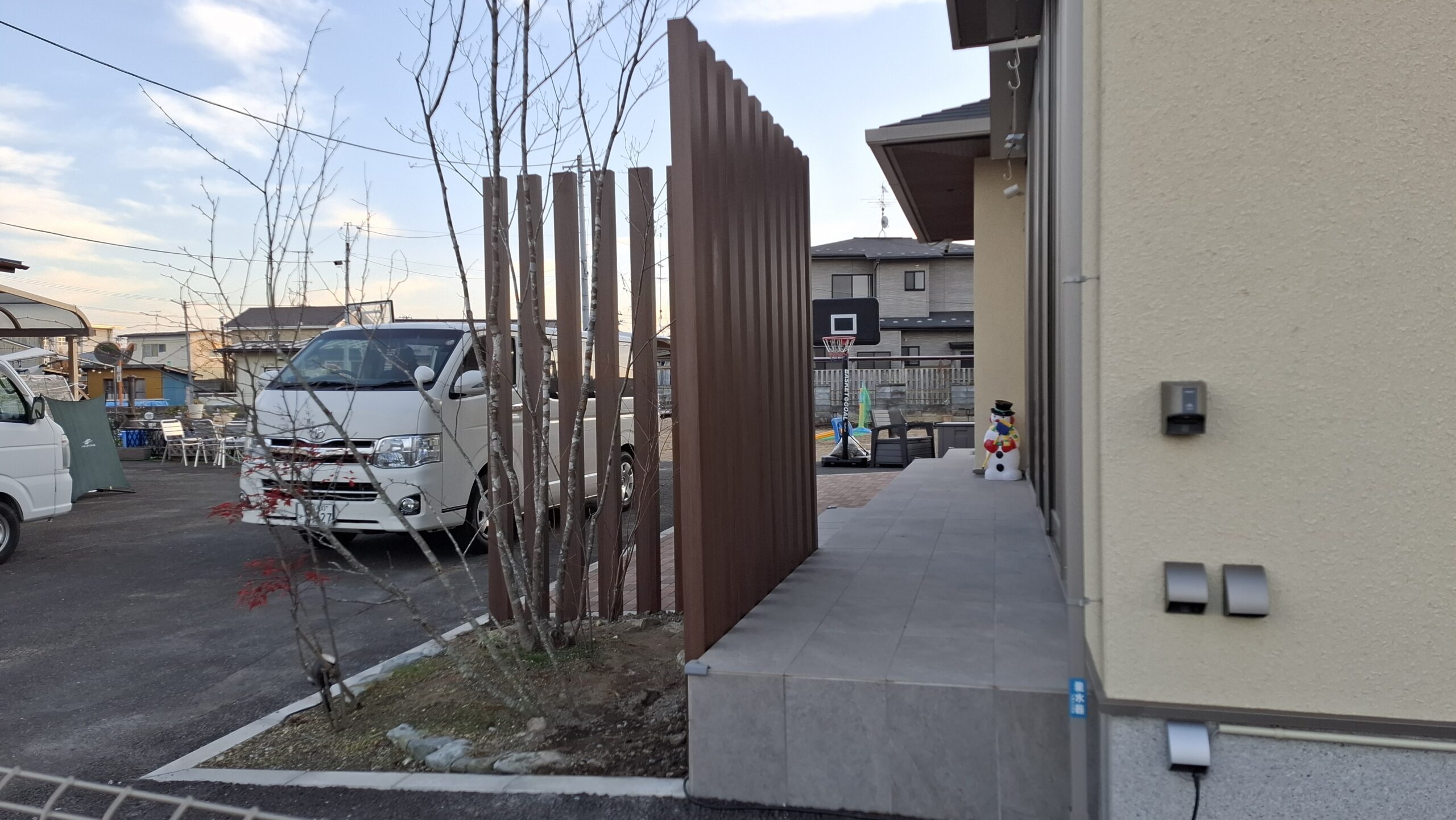高さが2.4mあるので通行人からの視線が気にならず建物にマッチしている為、とても良い感じでお洒落な外構になりとても喜んで頂きました。