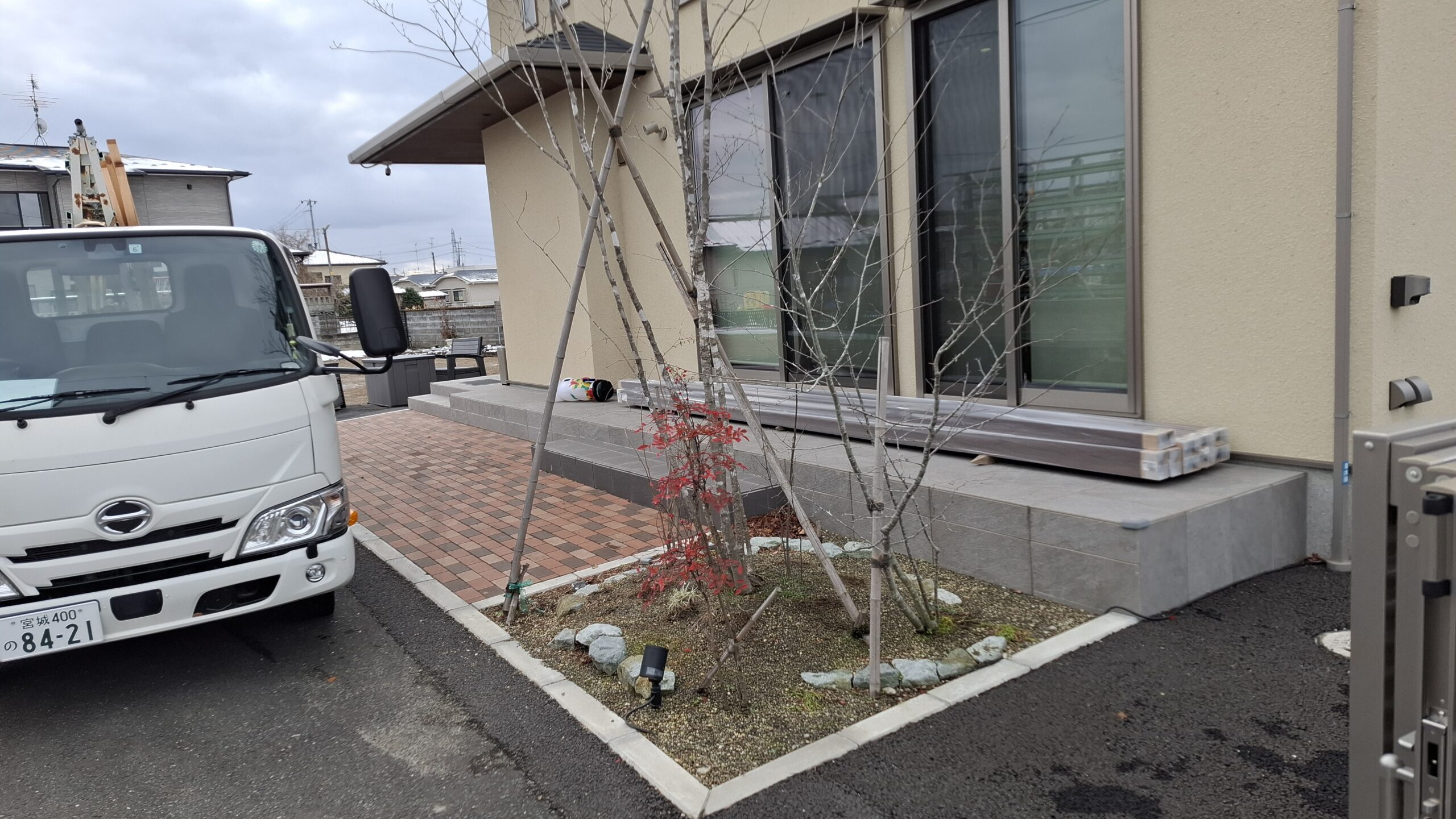 お施主から外構工事で、お洒落なアプローチにして欲しいとご要望がありましたので、通常の土間コンクリートだけだと建物周囲が殺風景となってしまうため、駐車場のコンクリートの横は乱形石張りのアプローチとし、赤色の石を使用する事でコンクリートの白色とメリハリがつきとても良いアプローチだとご満足いただけました!
