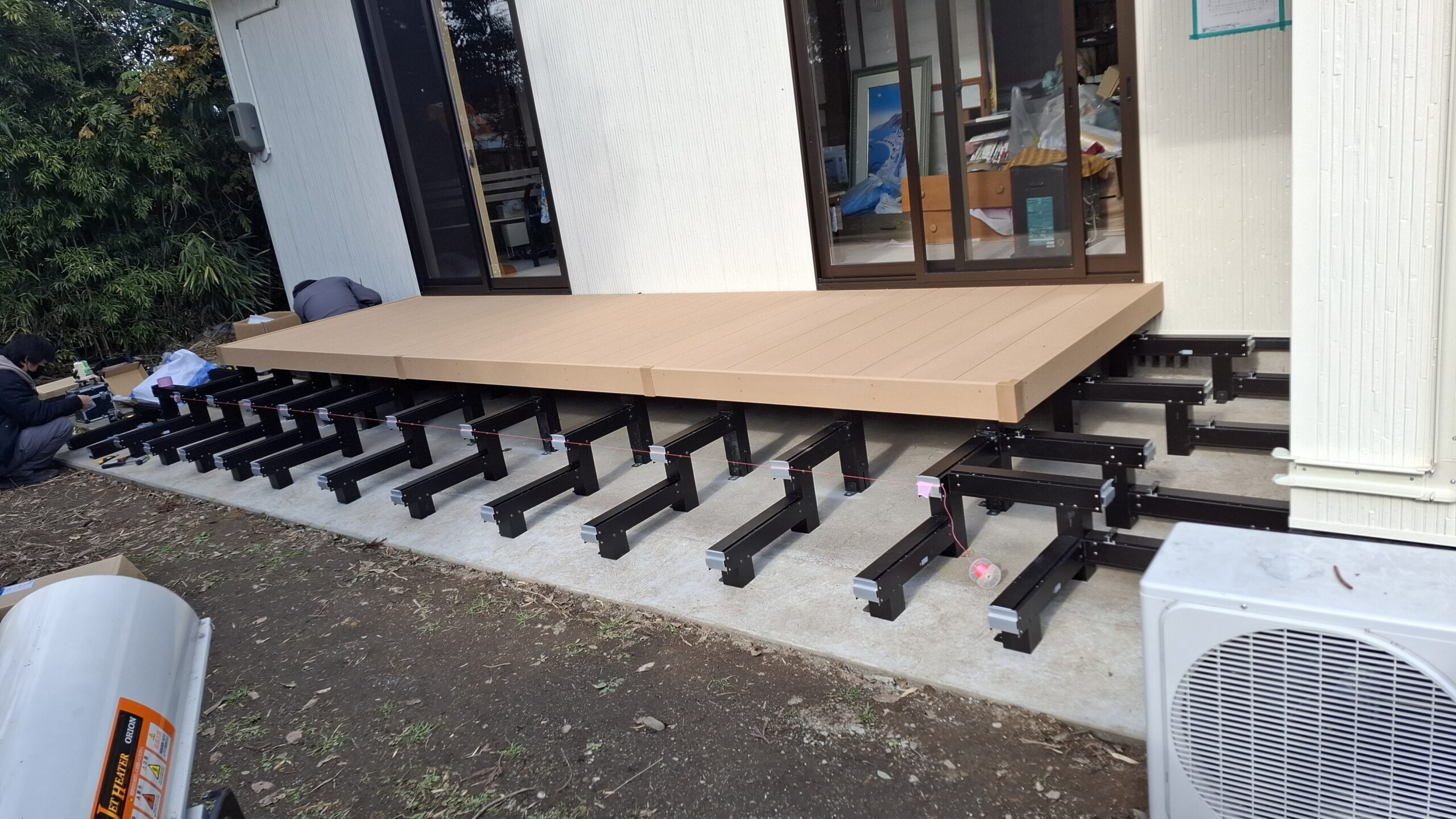今回施工したのは通常のデッキに、2段の床を取付する多段床施工で取り付けし現場に合わせて土間コンクリートを延長して全て現場加工で施工を行いました。