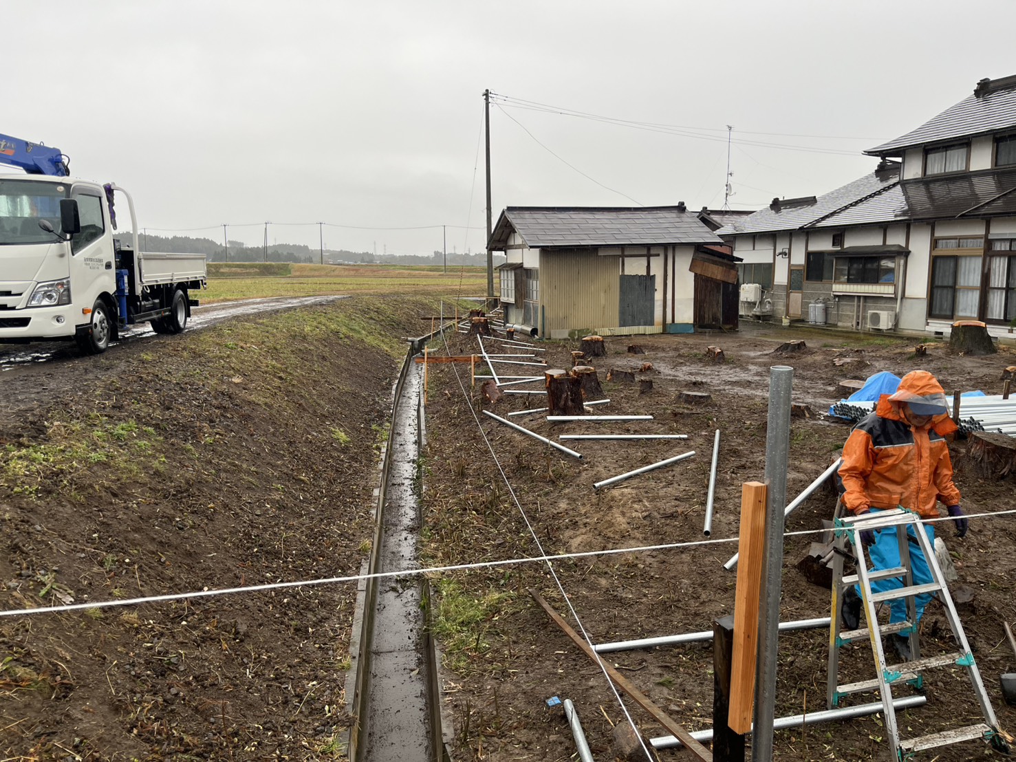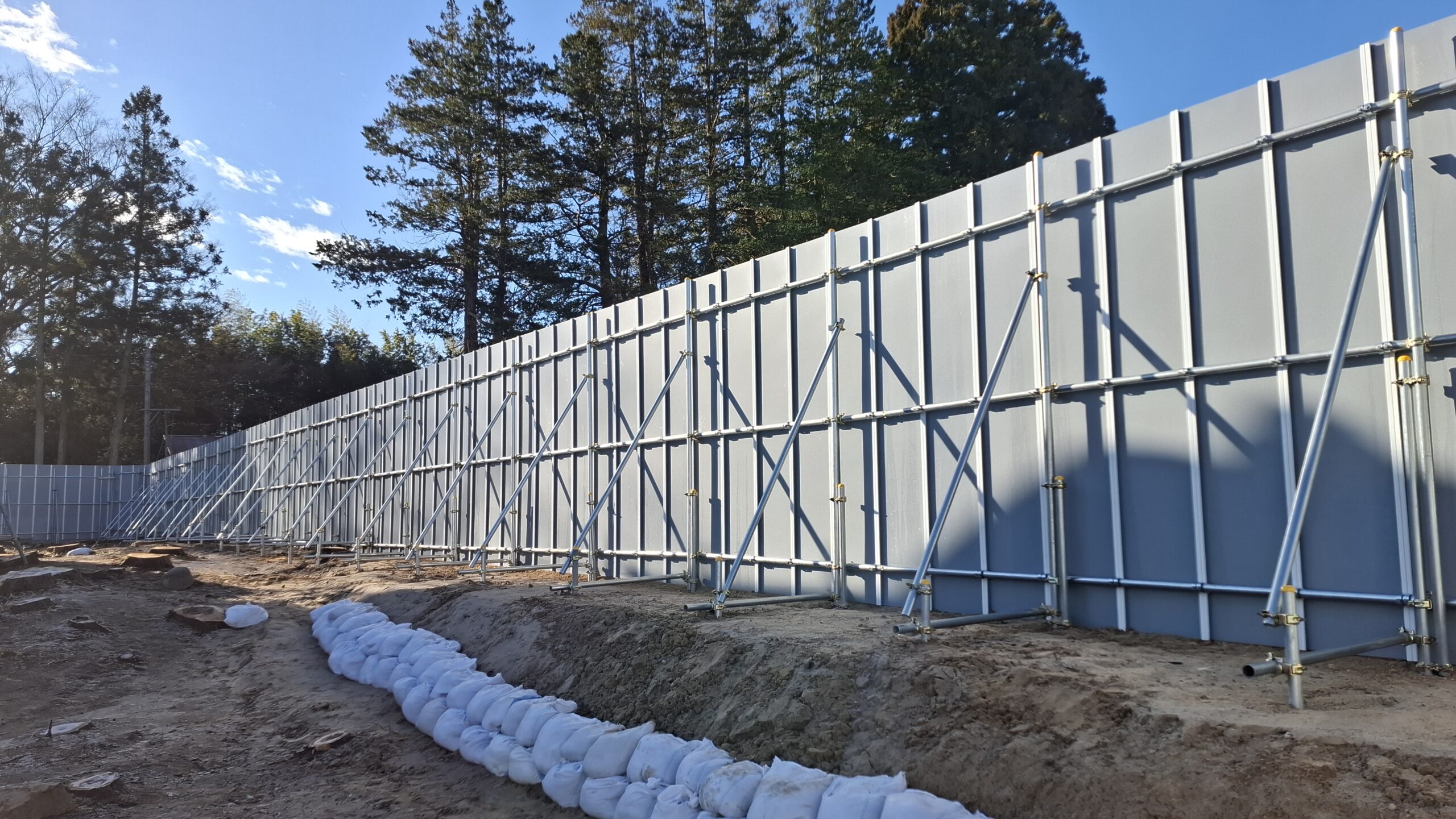 まずは杉林の伐採、処分を行い次に単管パイプを設置して高さが3mの鋼板製フラットパネルを全長100mを施工いたしました。