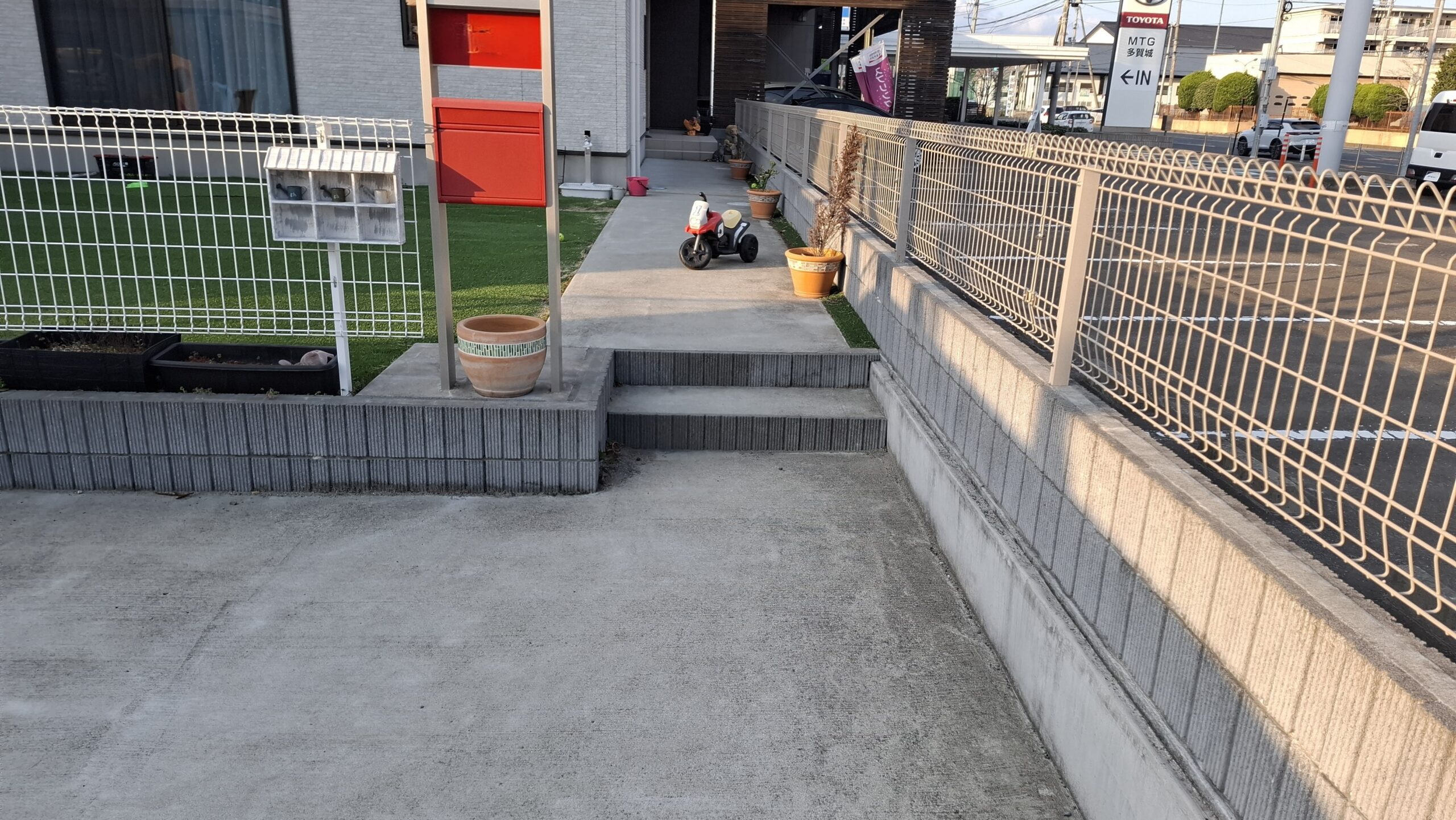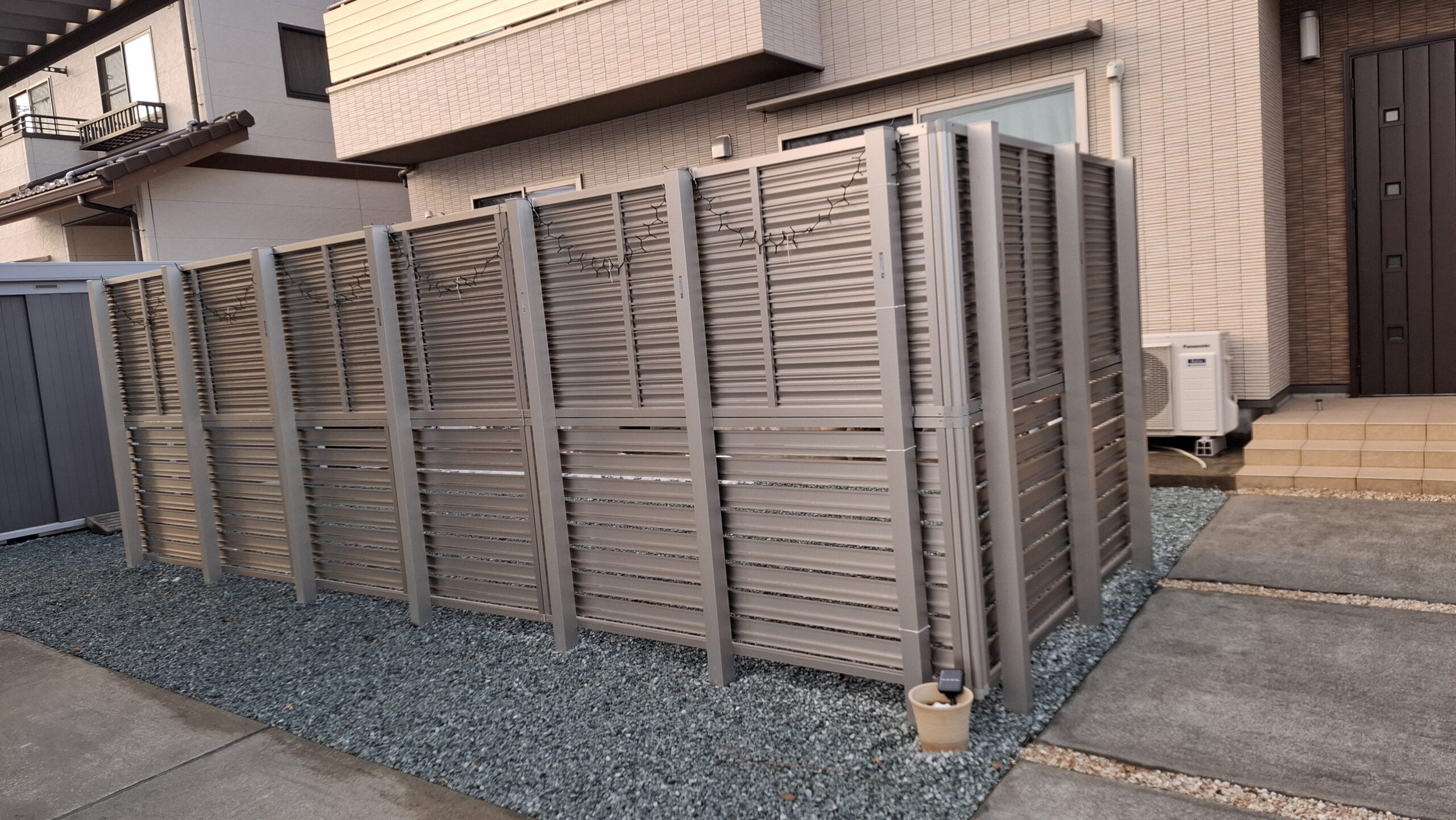 場所が住宅密集地でお隣さんの視線が気になるから、目隠しが欲しいとの要望がありましたので、既存のコンクリート塀を利用して高さ1.2mのフェンス、 コンクリート塀がない場所はコンクリートに穴を空けて高さ1.6mのフェンスを設置致しました。