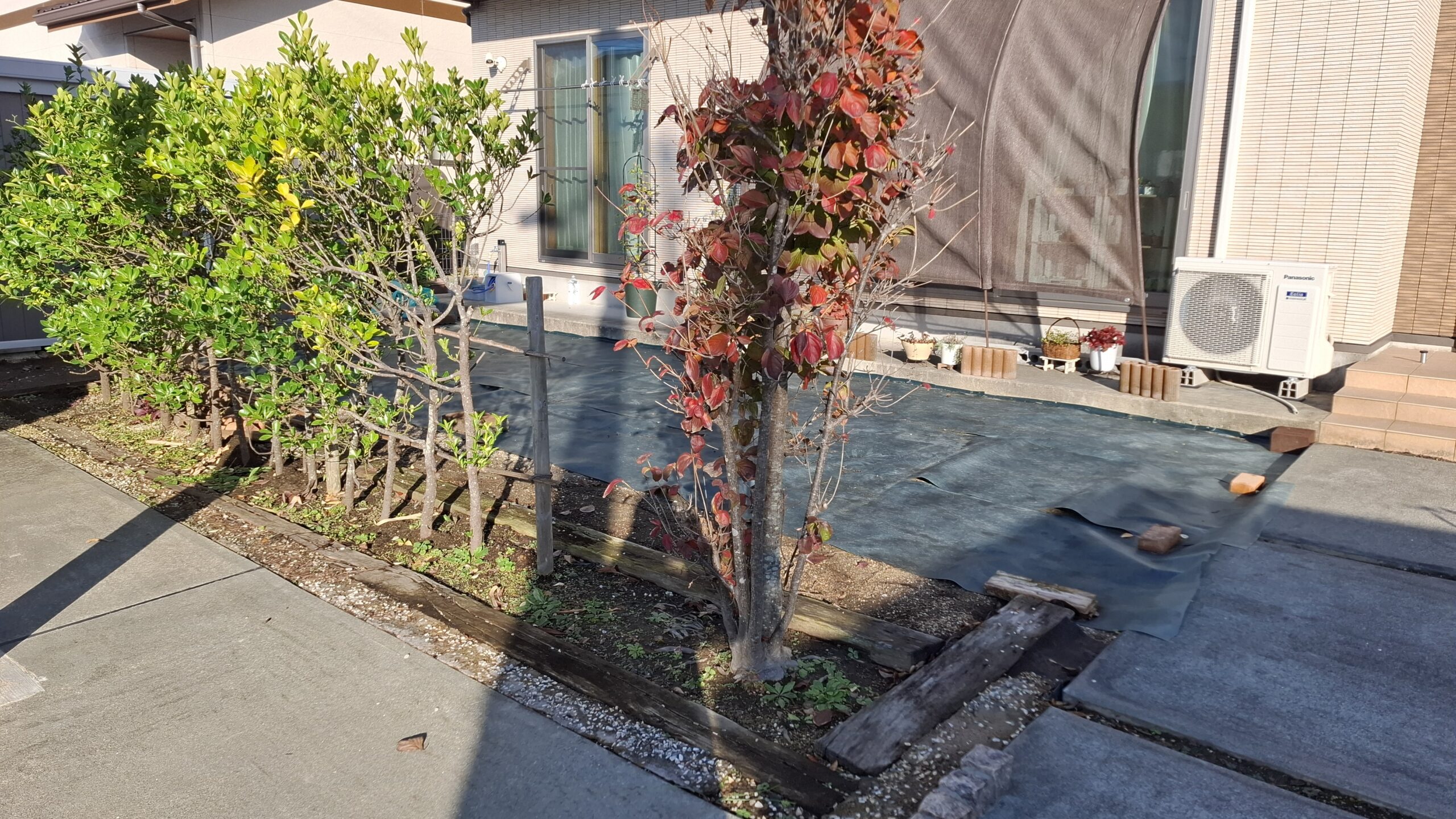 今回は目隠しの植栽があった為、全て伐採伐根を行い防草シートを敷均し後にYKKAPルシアス木調2段フェンスH1900、上段は完全目隠しで視線を遮り、下段は横スリットで隙間が15mm程度あるルシアスフェンスを採用しました。室内側から見たときに一定の隙間がある為圧迫感がありません。